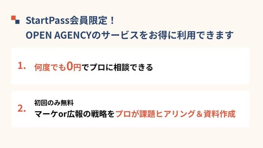 StartPassユーザーは、OPEN AGENCYにてマーケティングと広報に関する無料の相談と初回の戦略資料作成サービスを受けられます。これにより、起業家はマーケティングや広報