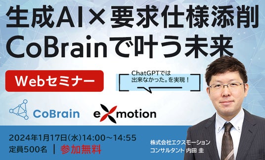 株式会社エクスモーション(代表取締役社長:渡辺 博之)は、ソリューション「生成AI×要求仕様添 CoBrain(コブレイン)」を開発し、その活用によりもたらされる要求仕様書作成の未来をお伝えするWEBセミナーを開催いたします。組み込みシステムの大規模化・複雑化が進む中、システムの要件を明確に定義する要求仕様の重要性は高まっています。近年コードの作成など、生成AIが人に代わって作業をする場面が増えていますが、要求仕様作成においては難しく、一般的な生成AIで適切な要求仕様は作成できません。そこで当社は生成AIの技術を活用し、上流工程の専門知識を持つ生成AI「CoBrain」を開発しました。CoBrainは当社が長年培ったナレッジを取り入れ、利用者が作成した要求仕様を圧倒的速度で的確にレビューします。従来コンサルタントが提供していた専門知識を、CoBrainを通じて多くの人が活用できるその仕組みについて解説いたします。