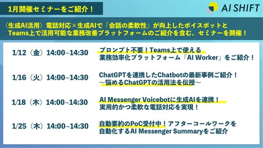 <生成AI活用>電話対応×生成AIで「会話の柔軟性」が向上したボイスボットとTeams上で活用可能な業務改善プラットフォームのご紹介を含む1月開催オンラインセミナー