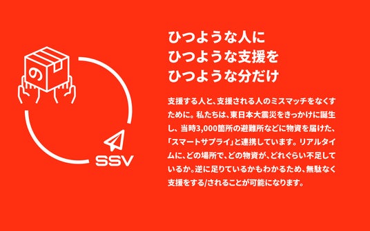 東日本大震災をきっかけに誕生し、 当時約3,000箇所の避難所などに物資を届けた「災害時の物資支援の仕組み」です。3.11の直後、多くの人が物を送りました。ところがこの方法には大きな課題がありました。送る人同士が協力する方法がないので必要な分を越えてしまった物はゴミとなり捨てるのにお金がかかってしまうのです。この課題を知った人はやがて物を送らなくなりました。多くの人が募金をしました。この方法にも課題がありました。100人いれば100通りの思いで募金をしたお金が誰のためにどのように使われるのか実感が持てないのです。そこで、「必要なひとに、必要な支援を、必要な分だけ」支援することをコンセプトに「スマートサプライ」が誕生しました。「届け.jp」はスマートサプライと連携しながら、無駄のない、的確な支援を行います。