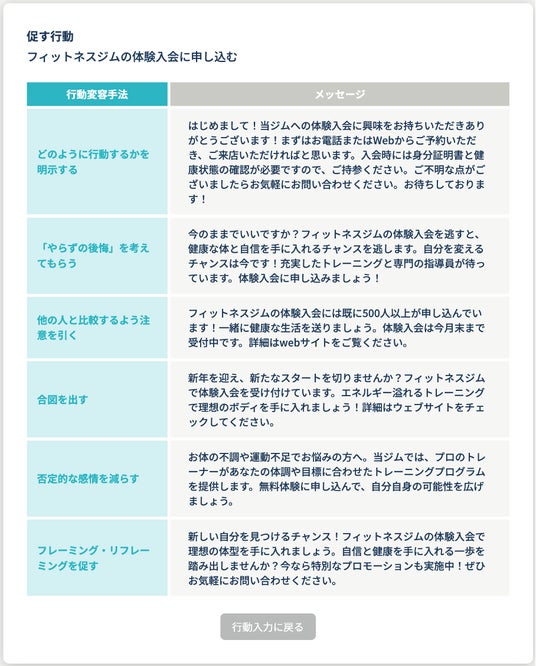 (例)「フィットネスジムの体験入会に申し込む」と入力した場合:入力した行動を促すための6種類のメッセージ文章が自動生成される