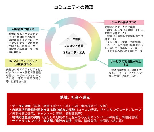 自転車活用推進計画について(国土交通省)交通インフラの整備や地域側の受け入れ態勢を構築するという意味では非常に有効な政策ですが、交流人口の拡大、観光誘致、情報発信やデータの集計など、ソフトの側面では様々な課題を抱えています。当社は、CyclingFriendsを通じて、専門性、技術、データ、顧客ネットワークと発信力を提供することで、それらを支える新しいインフラになり、最終的には日本の地方の過疎化対策の一翼を担うことを目指しています。 CyclingFriendsの仕組み