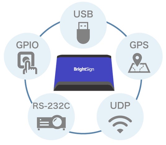 RS-232C、USB、GPIO、UDPで外部機器接続し双方向のコントロールが可能です。オプションのセンサーを併用することで、プログラム開発なしにインタラクティブサイネージを簡単に実現できます。