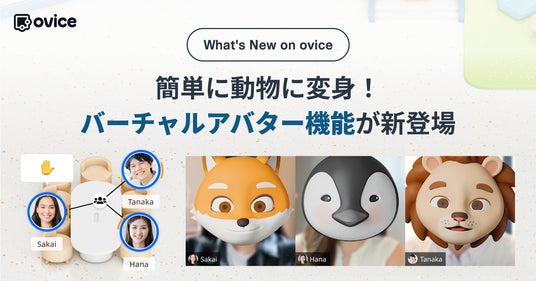 oVice株式会社(本社:石川県七尾市、代表取締役CEO:ジョン・セーヒョン)は、誰もが、どこからでも“つながる”バーチャルオフィス「ovice(オヴィス)」の新機能として、ビデオ通話時に簡単に動物に変身できる「バーチャルアバター」機能を公開しました。ライオン、ペンギン、キツネの3種類から選ぶことができ、顔の動きに合わせてバーチャルアバターの表情も変化するため、プライベート保護と非言語コミュニケーションを両立したビデオ通話を手軽に行うことができます。