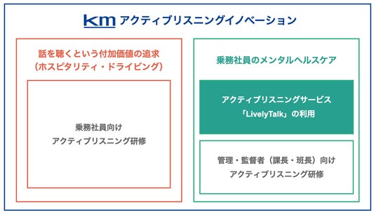 株式会社Lively(本社:神奈川県藤沢市、代表:岡 えり)は、企業で働く人のメンタルヘルスケアを目的とした、アクティブリスニングサービスの提供を開始いたします。サービス提供開始に伴い、神奈川県が実施する、大企業とベンチャー企業によるオープンイノベーション推進事業「ビジネスアクセラレーターかながわ(BAK)」の支援を受け、タクシー事業者として初の試みとなる、国際自動車株式会社(東京都港区、代表取締役社長 石井 仁)と共創プロジェクト「kmアクティブリスニングイノベーション」を開始します。