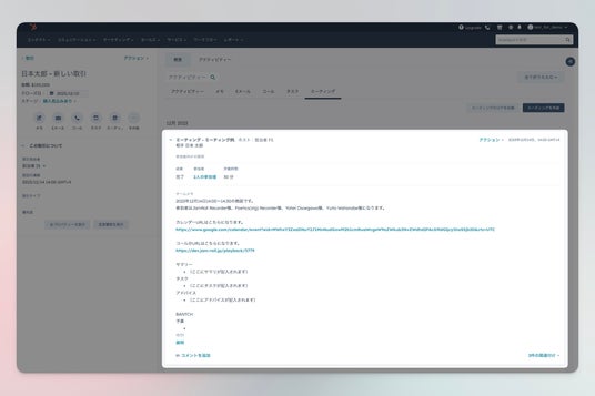 会議終了後、コンタクトおよび取引レコードの「アクティビティ」「ミーティング」に会議情報、サマリ、タスク、アドバイス、BANTCH情報が書き込まれます。