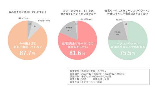 2023年12月に同社が実施した子どもがいる20代~40代の女性を対象とした「在宅ワークの実施」についてのインターネット調査の結果、80%以上が在宅ワークでの働き方をしたいと思っており、90%以上が在宅ワークでのパソコンやWEBスキルに不安があることがわかりました。(下図参照)