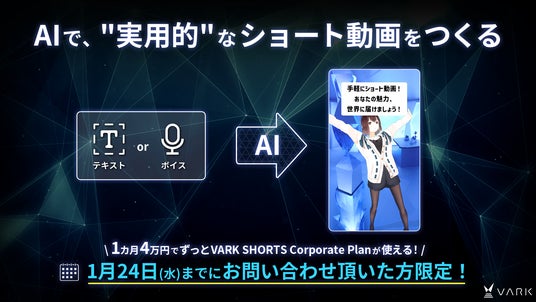 複数のエンターテイメントサービスを展開する株式会社VARK(本社:東京都豊島区 代表取締役:加藤卓也、以下VARK)は、1月17日(水)より、法人向けのショート動画制作ツール「VARK SHORTS Corporate Plan」に「AI × VARK SHORTS」機能を実装したことをお知らせいたします。また、機能の実装に伴いウェブページを公開いたしました。