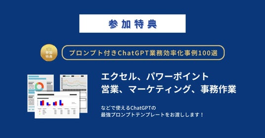 当セミナーに参加し、アンケートに回答いただいた方には『プロンプト付きのChatGPT業務効率化事例100選』を提供します。特典の詳細や受け取り方についてはセミナー内でご案内します。