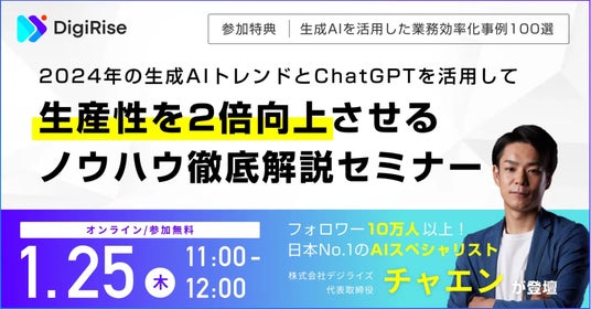 【2024年の生成AIトレンドが分かる】生成AIの波に乗り遅れない!ChatGPTを駆使して生産性を2倍向上させるノウハウ徹底解説セミナー開催。~生成AIを活用した業務効率化事例100選特典付き~