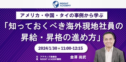 グローバル人材育成・研修業を手掛けるインサイトアカデミー株式会社(本社:東京都港区新橋、代表:北村 嘉章)は、無料webセミナー「アメリカ・中国・タイの事例から学ぶ~知っておくべき海外現地社員の報酬戦略」を2024年1月30日(火)11:00より開催します。