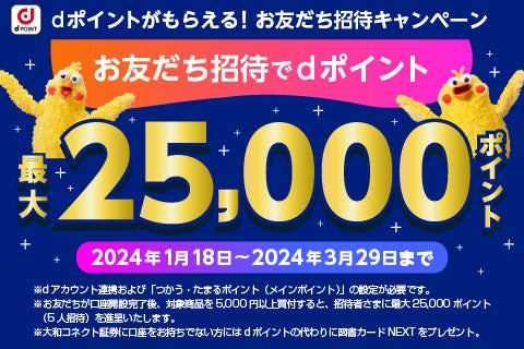 大和コネクト証券株式会社(本社:東京都中央区、代表取締役:大槻 竜児、以下「大和コネクト証券」)では『“最高に”使いやすく・使っていて“楽しい”取引アプリ「コネクト」を体験されているみなさまに、資産運用を検討されているお友だちを招待してもらいたい!!』という想いから、2024年1月18日(木)~2024年3月29日(金)までの期間限定で、「最大25,000dポイントプレゼント!dポイントがもらえる!お友だち招待キャンペーン」を実施いたします。