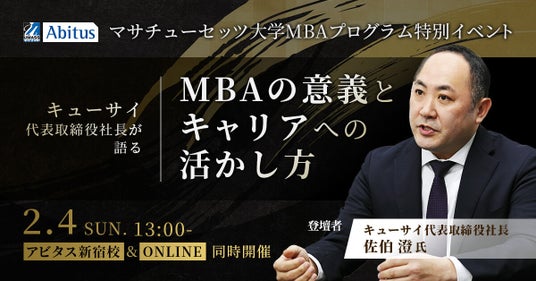 留学不要、完全オンラインで米国MBA(経営学修士)を取得できる「マサチューセッツ大学MBAプログラム」事務局は2月4日にキューサイ株式会社代表取締役社長の佐伯 澄氏をゲストにお迎えし、イベントを開催します。