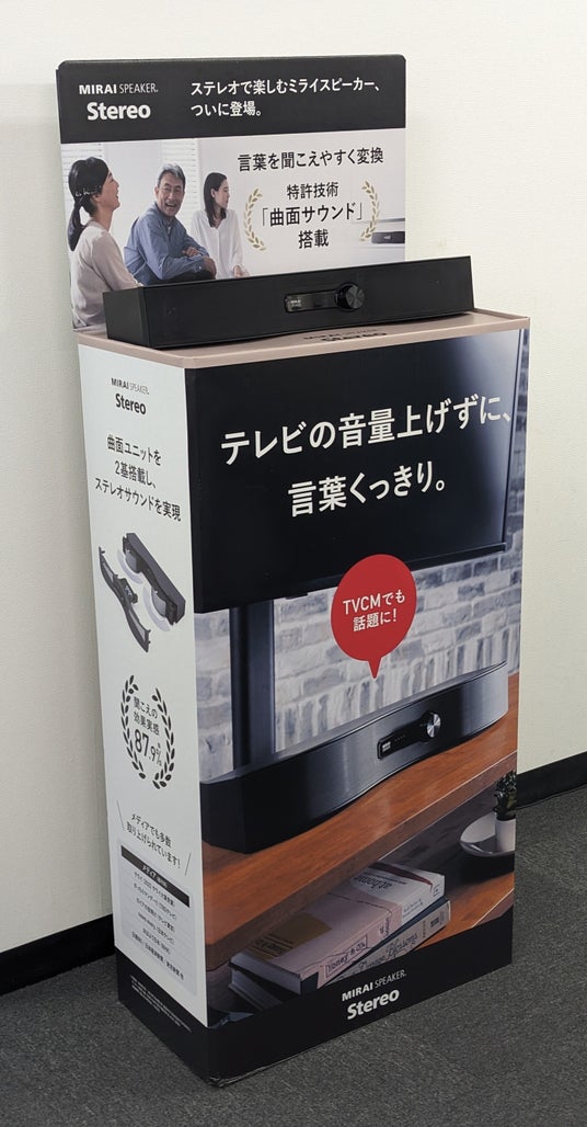 「ミライスピーカー(R)」は、加齢や生活習慣などから生じるテレビの言葉の聞こえにくさを改善するスピーカーです。ドラマや映画のセリフやニュースなどの音声がくっきりとクリアに聞こえるため、音量を上げずともテレビを楽しむことができます。搭載している独自技術『曲面サウンド』は、蓄音機のラッパ部分をヒントに、平板を湾曲させた振動板によって、広く遠くまでハッキリとした音声を届けることが可能です。この技術は国内特許だけでなく、PCT世界特許及び台湾特許に出願済です。シリーズ累計販売台数は20万台を突破※2しています。「ミライスピーカー」シリーズは、2020年5月の発売開始以来、自社ECやAmazon/楽天など、インターネットでの販売を中心に展開してまいりました。自社ECでは「まずは聞いてみたい」という方のために、60日間返金保証制度※3により、ご自宅での試聴を可能にしています。