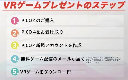 - 特典2は、(1) PICOアカウントのご登録、及び(2) 当該アカウントによるPICO Storeへのログインを完了頂くことが提供の条件となり、全ての条件の充足が確認された後、アカウント登録時にご登録頂いたメールアドレス宛に、特典2の提供に関するメールをお送りいたします。