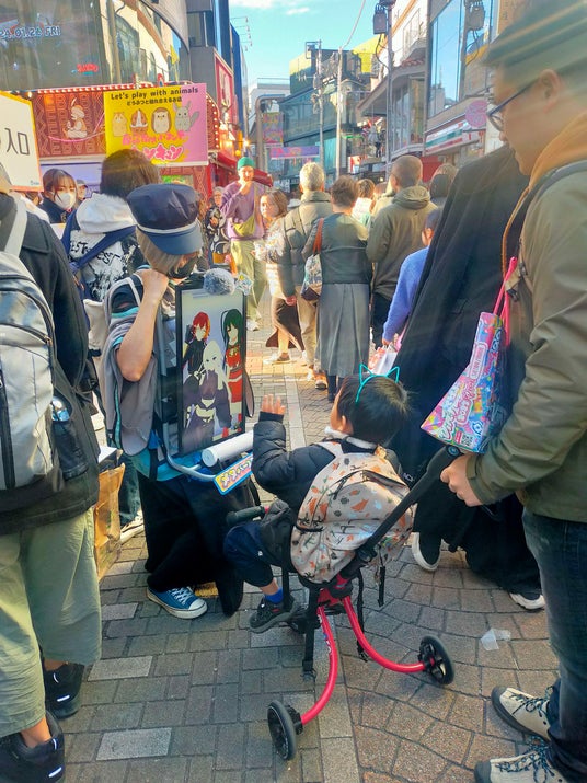 VketWalkはResoniteやVRChatなどのVRSNSプラットフォームのユーザーが、アバター姿のまま現実の街を歩き回ることができる完全可搬式ディスプレイシステムです。バーチャル↔現実の相互で音声、映像を介したコミュニケーションが可能です。