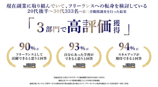 「自分にあった学習ができると思う」「スキルアップが期待できる」「フリーランスとして活躍できると思う」3部門で90%以上を獲得