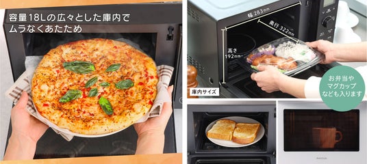 庫内は容量18Lで、中型のピザが入りムラなくあたためることができる大きさです。また、お弁当、マグカップなども問題無くすっぽりと入ります。