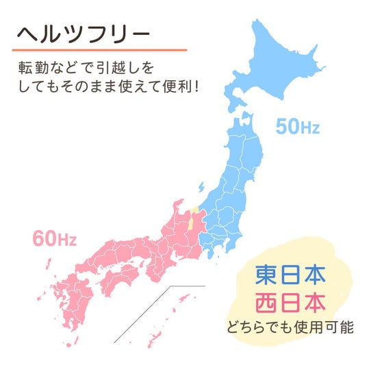 本製品は、東日本の50Hzと西日本の60Hzのどちらの周波数にも対応しているヘルツフリー仕様となっておりますので、転勤や引っ越しによりお住まいの地域が変わってもそのままご使用いただけます。