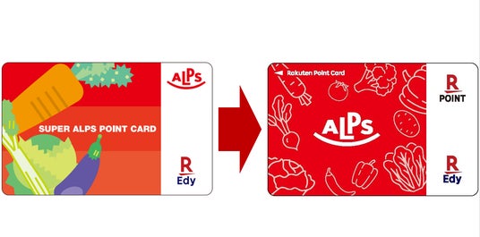 スーパーアルプスと楽天ペイメント、楽天Edy株式会社は、2024年春頃より「楽天ポイントカード」、IC型電子マネー「楽天Edy」を搭載したオリジナルデザイン「アルプスEdy-楽天ポイントカード」を発行します。これまで発行していた「Edy付きスーパーアルプスポイントカード 」および自社ポイント「アルプスポイント」のサービスを終了し、「アルプスEdy-楽天ポイントカード」へ順次切り替えを行います。