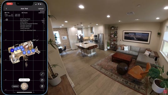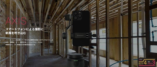 リビングCGが提供する「Matterport Axis」は、先進的な3Dスキャン技術を搭載した自動回転雲台で、iPhoneなどのスマートフォンを装着して使用します。