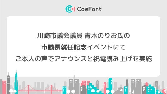 AI音声プラットフォーム「CoeFont」を提供する株式会社CoeFont(本社:東京都港区、代表取締役:早川 尚吾、以下当社)は、川崎市議会議員である青木のりお氏ご本人の声をもとに作成したAI音声および当サービスで提供するAI音声が、2023年11月14日に開催された「青木のりお 第四十四代川崎市議会議長就任を祝う会」において活用されたことをお知らせします。