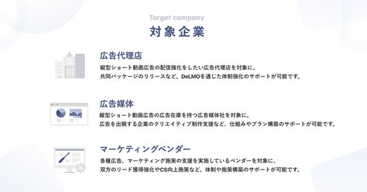 縦型ショート動画広告の配信強化をしたい広告代理店を対象に、共同パッケージのリリースなど、DeLMOを通じた体制強化のサポートが可能です。