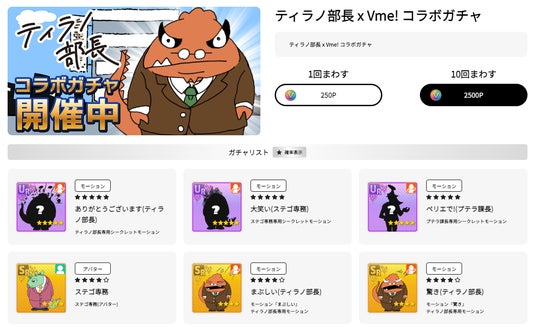 ▼「Vme!ガチャ」ティラノ部長コラボは下記から