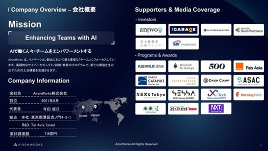AironWorksは "Enhancing Teams with AI" を企業ミッションに、イスラエルで開発する先進的な技術を駆使したサイバーセキュリティソリューションで、よりよい社会の創出、働く人々・チームをエンパワーメントします。