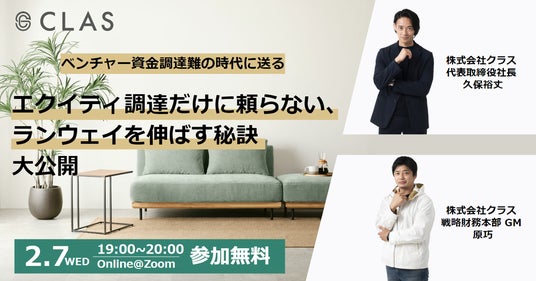 認知度No.1(※1)の家具と家電のレンタル・サブスク「CLAS(クラス)」(https://clas.style/)を運営する、持たない、捨てない社会をつくる株式会社クラス(本社:東京都目黒区、代表取締役社長:久保 裕丈)は、2024年2月7日(水)19時より、「ベンチャー資金調達難の時代に送る、エクイティ調達だけに頼らない、ランウェイを伸ばす秘訣 大公開」を開催いたします。