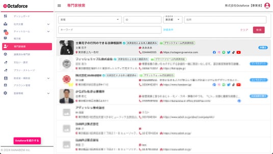 専門家検索1.専門家検索Octaforceに登録している事業者・専門家を検索してコンタクトでき、顧問契約や、個別の案件依頼について契約前に相談することができます。