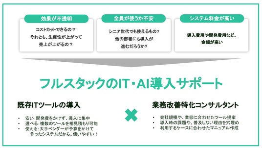 フルスタック株式会社はサービスの業務活用を推進するべく、生成AIを用いた、IT化・AI導入の予算シミュレーションサービスをリリースしました。