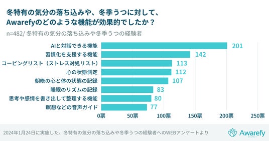 続いて、Awarefyアプリの中で冬季うつや気分の落ち込みに効果があった機能をアンケートしたところ、圧倒的な1位となったのが「AIと対話できる機能」でした。
