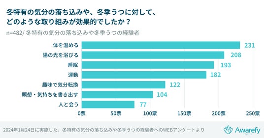 - 冬季うつなどに効果のあった取り組みの上位は、「体を温める」「陽に当たる」「よく眠る」「運動する」。