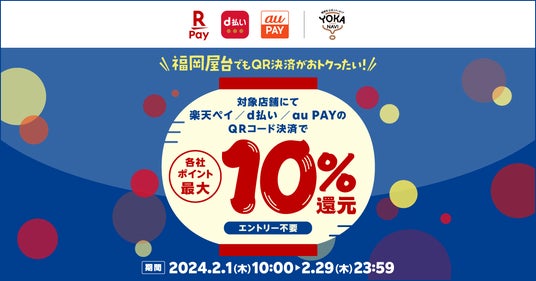 楽天ペイメント株式会社(以下「楽天ペイメント」)、株式会社NTTドコモ(以下「NTTドコモ」)、KDDI株式会社(以下「KDDI」)は、各社が運営するキャッシュレス決済サービス「楽天ペイ」「d払い(R)」「au PAY」において、2024年2月1日(木)から2月29日(木)まで「福岡市屋台応援キャンペーン!キャッシュレスで最大10%戻ってくる!」を実施することをお知らせします。コード決済サービス事業3社共同で、地域のキャッシュレスを推進するキャンペーンを開催するのは、全国で初となります。