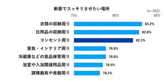 回答者全員に、新居でスッキリさせたい場所を尋ねたところ、トップ3は「衣類の収納周り」(83.2%)、「日用品の収納周り」(82.8%)、「コンセント周り(テレビ・レコーダー・PC・スマホ・ゲームなどがあるスペースのいずれか)」(82.1%)となりました。トップ3はいずれも8割以上の人がスッキリさせたい場所として選んでいます。