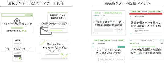 ・回答の収集方法は、WEB(回答URL)、QRコード、メール配信の3つがあり、最適な方法で、お客様からアンケート回答を収集することができます。