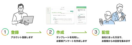 ご利用開始までの流れは、すべてWEBで完結します。登録→作成→配信の簡単3ステップで運用をスタートしていただけます。