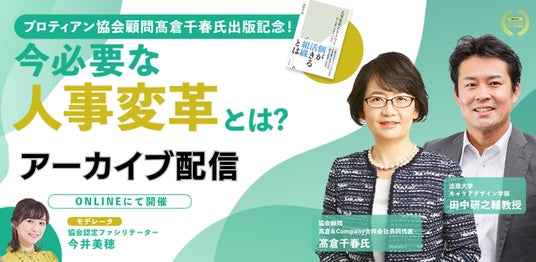 一般社団法人プロティアン・キャリア協会(東京都新宿区、代表理事:田中研之輔・有山徹、以下「当協会」)は、組織と個人のより良い関係構築と個人の主体的なキャリア開発を支援する団体です。この度、当協会の顧問を務めるロート製薬元取締役(CHRO)高倉&Company合同会社共同代表 高倉千春氏をお招きし、2023年12月20日(水)・2024年1月10日(水)に「プロティアン協会顧問 高倉千春氏出版記念!今必要な人事変革とは?」セミナーを開催しました。両日合わせて約230名の応募があった本セミナーのアーカイブ配信の申込みを開始します。