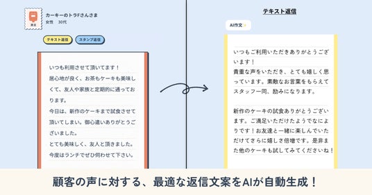 そこで、品質を保ちながらも返信作業の効率化を実現するための取り組みとして、AIを活用して返信内容を自動生成できる機能を搭載しました。これにより、顧客からの投稿内容を踏まえた最適な返信文案を自動生成でき、効率的に高品質な返信対応することが可能となります。弊社は今後も、きめ細かなVOC施策に取り組むための、「コミュニケーションの品質維持」と「業務効率化」の両立を実現できるサービス開発を進めてまいります。