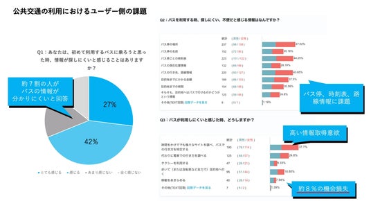 約7割のユーザーはバス情報が分かりにくいと感じ、約8%の利用者が、バスの情報取得が難しいことを理由に、「バスに乗らない」という選択をしています。