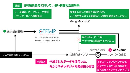 この度、ジオ・マークの開発した『スーパー路線図』を利用し、「バス情報が分かりにくい」という課題を解決する取り組みが、東京都のスタートアップ戦略である、社会課題の解決に取り組むスタートアップから、自らの技術・製品等を活用した都政に対する提案を募集する「スタートアップによる事業提案制度」に採択され、都営バスにおいて課題解決への挑戦が実現しました。