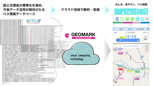 本実証で利用するバス情報は、国土交通省により標準化が進められているオープンデータ「GTFS-JP」を利用します。本データを解析しマップエンジンに実装することで、デジタルマップ上でバス停の位置、バス路線図、時刻表情報を視覚的に分かりやすく表示できます。ジオ・マークは、このバスの標準データフォーマットを地図上で分かりやすく表示するサービスシステムを「SUPER路線図」と名付け、今後の活用拡大を目指しています。