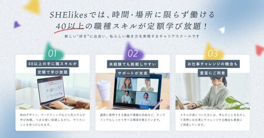 SHElikesは、時間や場所にとらわれずに働ける40以上の職種スキルが定額で学び放題の女性向けキャリアスクールです。Webデザイン・Webマーケティング・ライティングなどパソコン一つで働けるデジタルスキルやクリエイティブスキルを学ぶことで、私らしい働き方の実現を支援します。