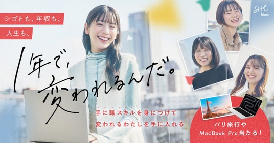 ている方に向けて、「変わるきっかけ」を提供します。新しい年を迎え、新たな一歩を踏み出すことで、働き方、そしてその延長の人生も変えていけるというメッセージを込めています。今回、イメージモデルの貴島明日香さんがインタビューに挑戦し、SHElikesを通して実際にキャリアチェンジを成功させた3名の受講生の体験談を公開しています。これといった強みや、今の場所以外で通用するスキルがないと感じていた自分から一歩踏み出し、その後思い描くキャリアチェンジを実現した過程について、同世代の貴島さんだからこそ聞き出せた等身大のエピソードをご覧ください。