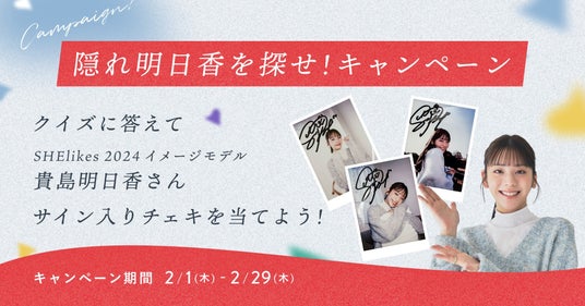 SHElikes2024キャンペーンサイト上に、至る所に大小様々な貴島明日香さんが隠れています。隠れている明日香さんの数の三択クイズに正解された方の中から、抽選で7名様に明日香さんサイン入りチェキをプレゼントいたします。