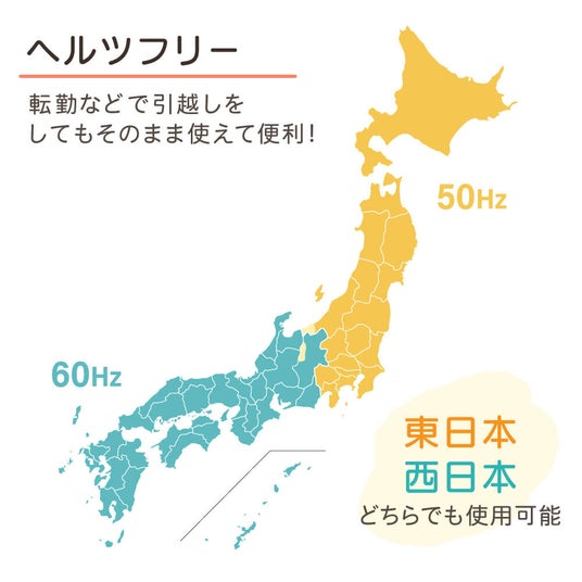本製品は、東日本の50Hzと西日本の60Hzのどちらの周波数にも対応しているヘルツフリー仕様となっておりますので、転勤や引っ越しによりお住まいの地域が変わってもそのままご使用いただけます。