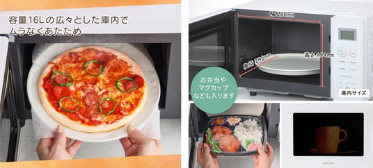庫内は容量16Lで、中型のピザを収納してムラなくあたためることができます。また、お弁当、マグカップなども問題無く入るので、日常生活でフル活用することができます。
