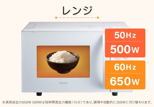 ※高周波出力650W、500Wは短時間高出力機能(15分)であり、調理中自動的に350Wに切り替わります。
