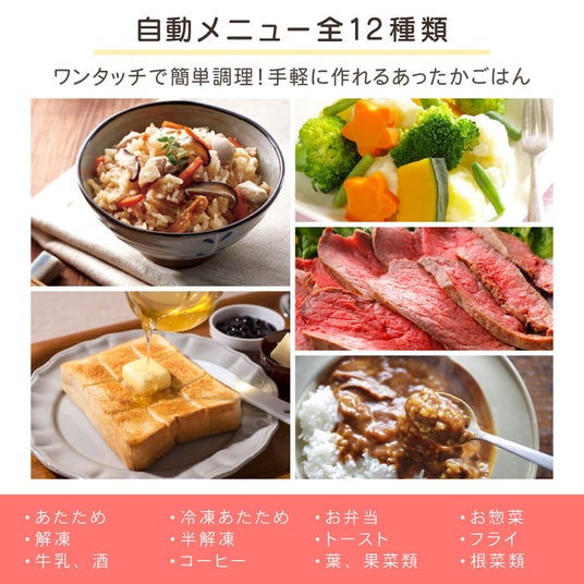 搭載されている豊富な自動メニュー機能によって、あたたかい食事が手軽にワンタッチで簡単に調理できます。自動メニューの種類は以下の画像の下部にある通り全12種類で、一人暮らしの方や忙しい方にもぴったりの機能です。